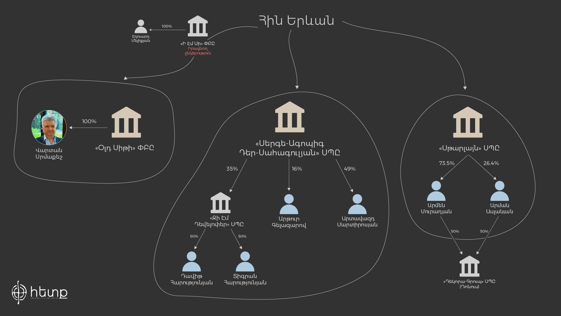 Անցնենք մյուս բաժնետիրոջը. «Սերգե-Ագոպիգ Դեր-Սահագույան» ՍՊԸ-ի գործընկեր, «Հին Երևանի» կառուցապատող «Սթարլայն» ՍՊԸ-ի բաժնետերերը «Դոմուսի» հիմնադիր «Դեկորա-Գրուպի» սեփականատերերն են՝ Արմեն Մուրադյանն ու Արման Ասլանյանը` համապատասխանաբար 73.5% և 26.4%։ Նրանք, բացի «Դոմուս» խանութների ցանցից, նաև ընդգրկված են շինարարության և հյուրանոցային բիզնեսում։ Հիշեցնենք՝ վերջիններս նաև Հիդրոմետի շենքն էին վերածում հյուրանոցի, որն այժմ դարձել է Hayasa Hotel Yerevan.