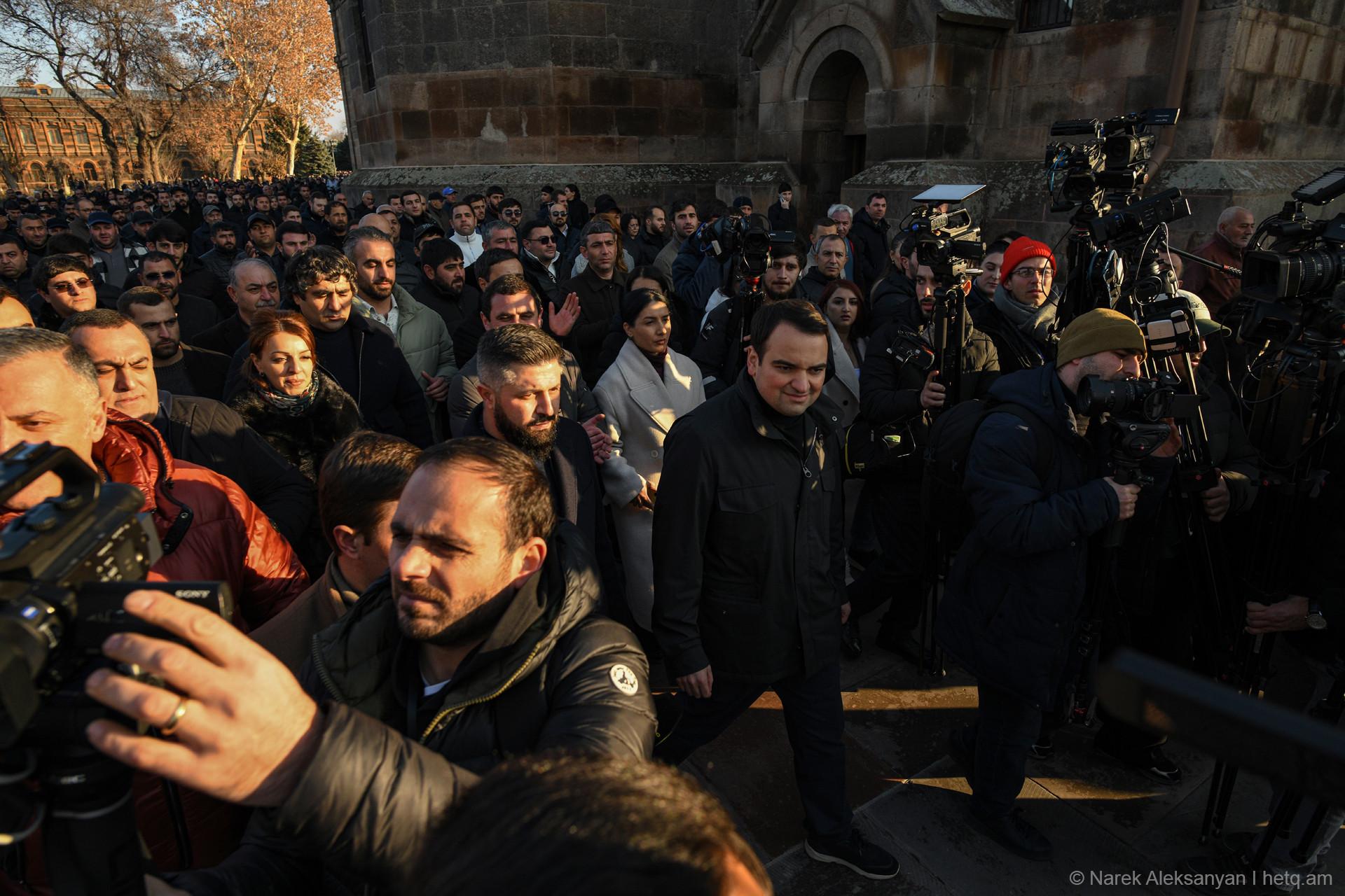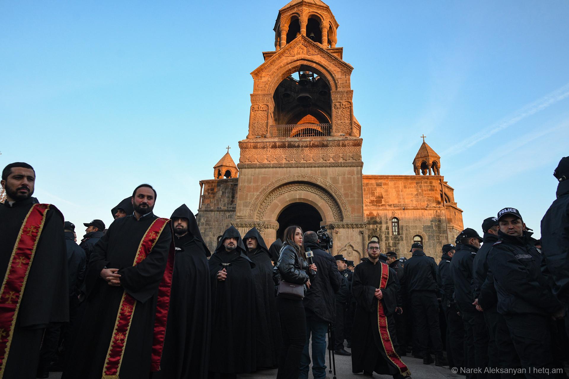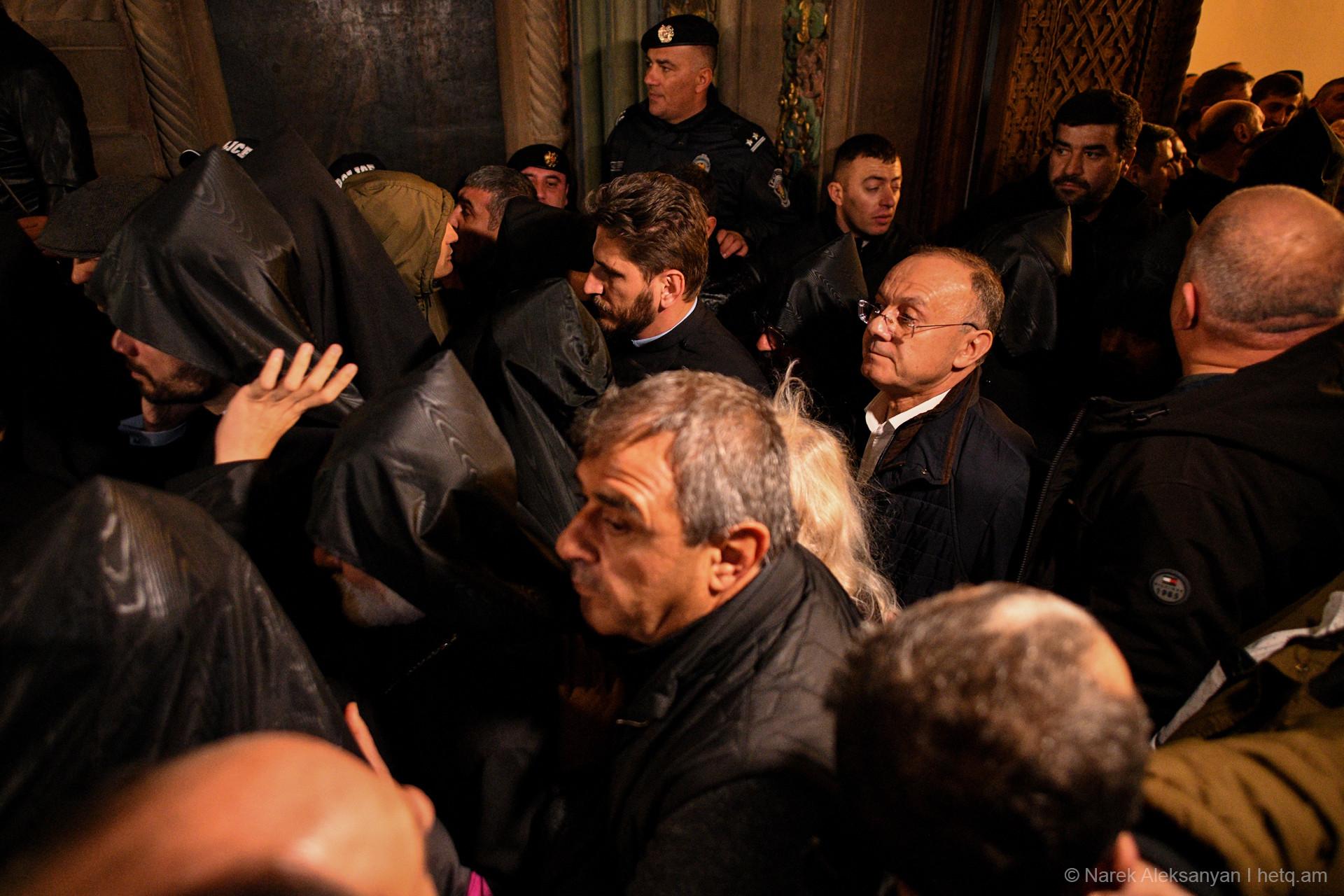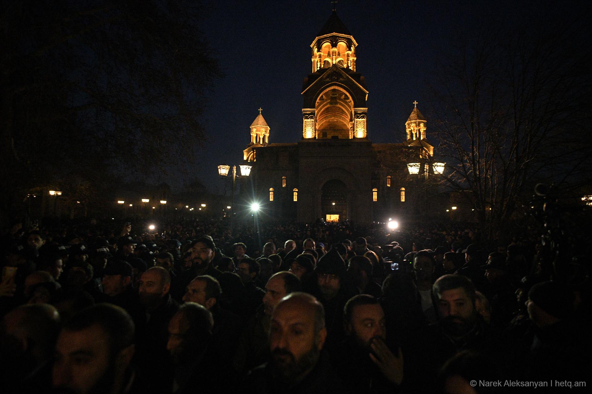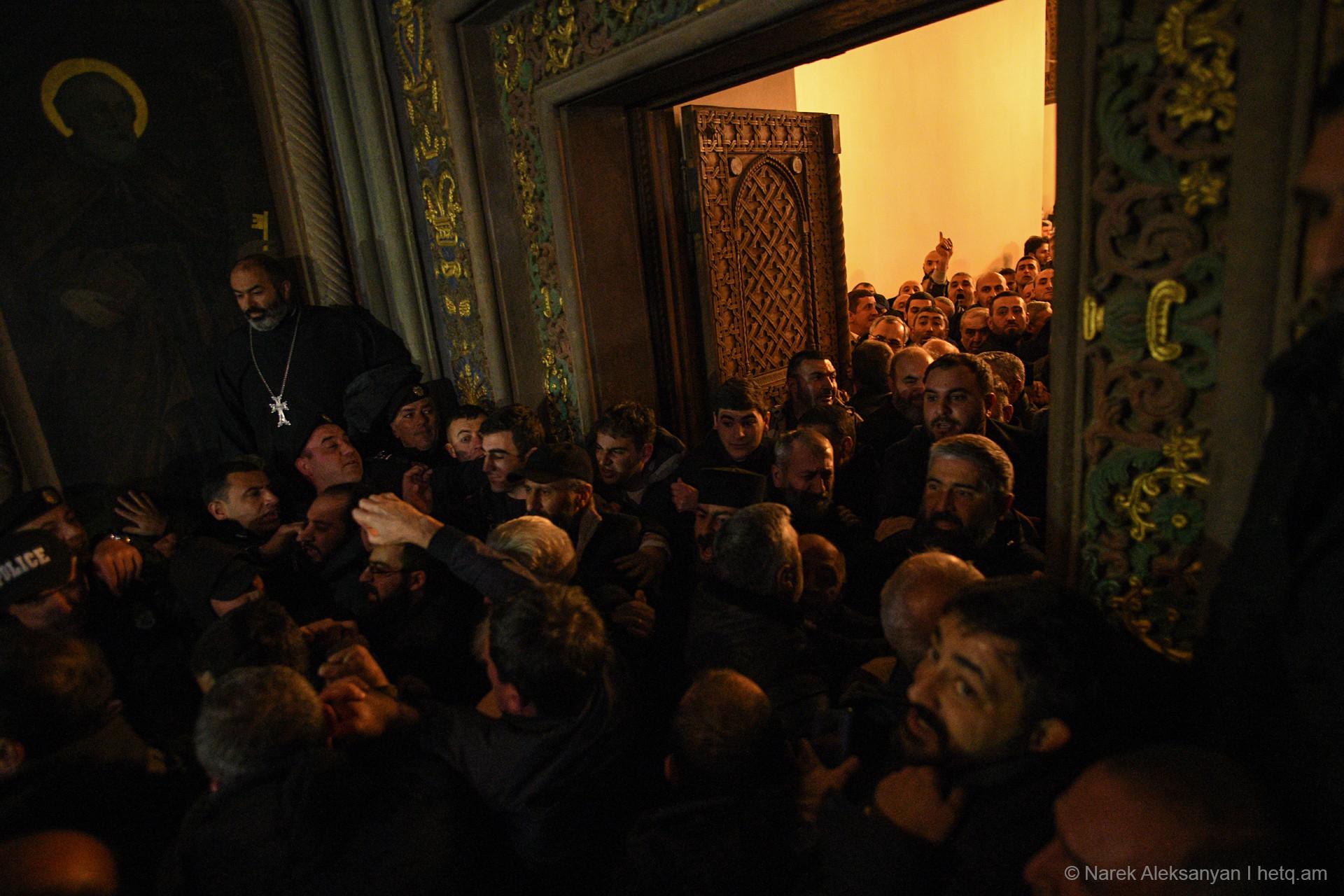 Քիչ անց Մայր Աթոռի բակում հավաքված քաղաքացիները դուրս եկան եկեղեցու տարածքից։ Ավելի վաղ Մայր Աթոռից հեռացել էին եպիսկոպոսները, որոնց անունից հայտարարություն էր տարածվել՝ հավաքվել Մայր Աթոռ Սուրբ Էջմիածնում՝ Կաթողիկոսին հանգստի կոչելու պահանջով։