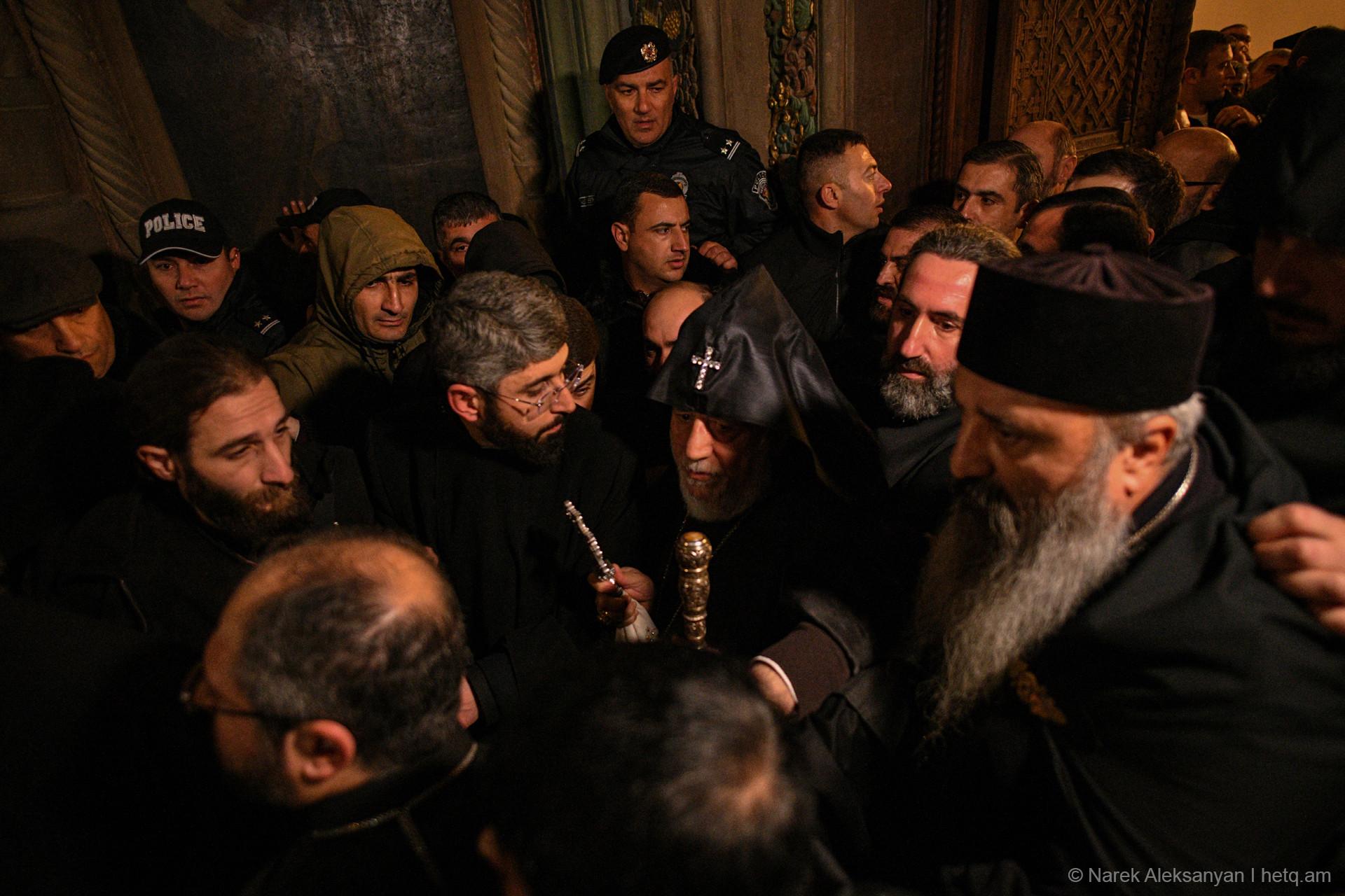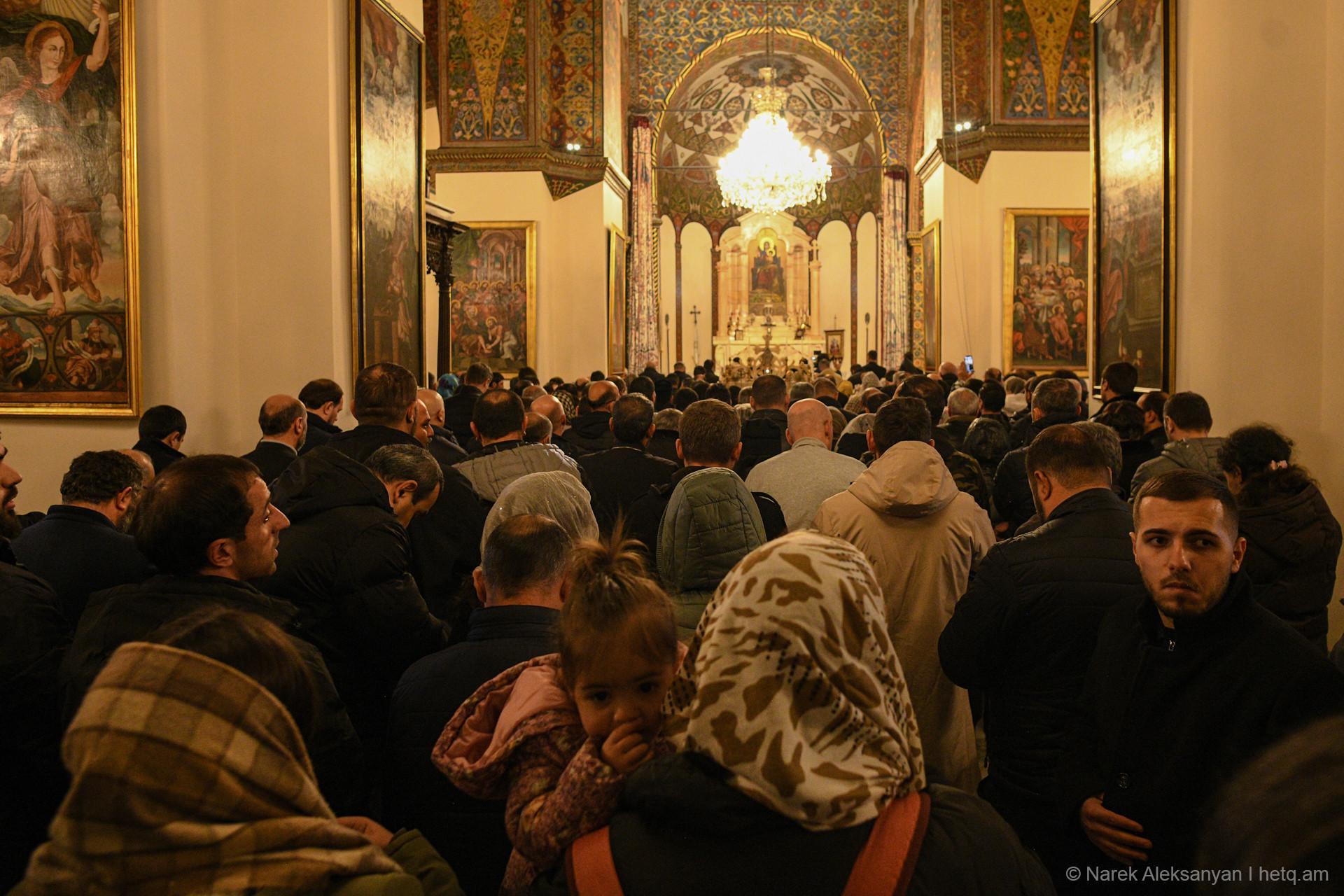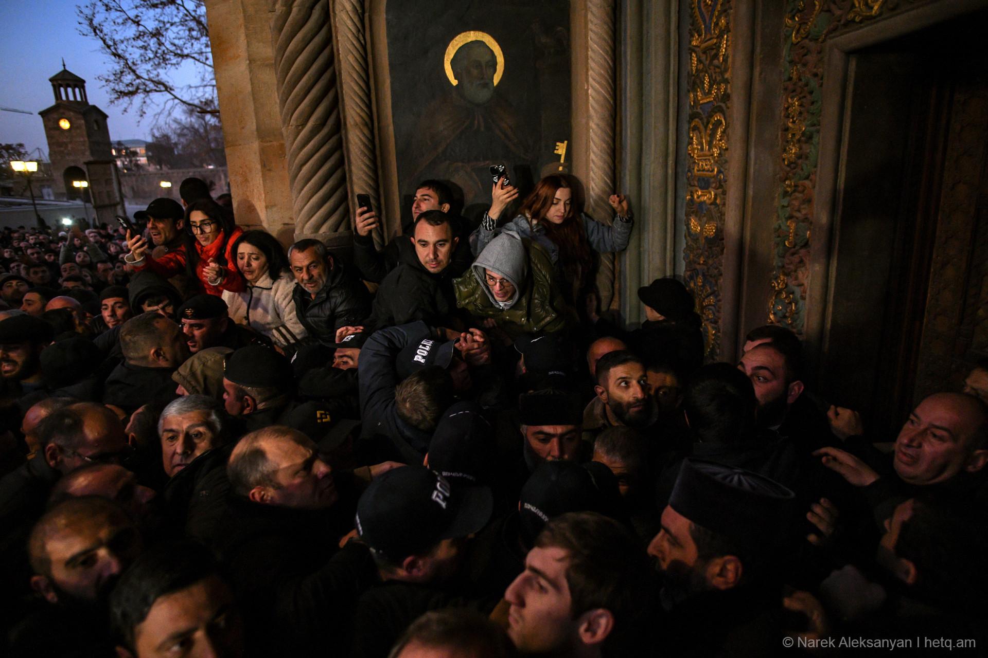 Եկեղեցու բակում հավաքվել էր Վեհափառին աջակցություն հայտնելու եկած ժողովուրդը, իսկ բակի մյուս թևում հավաքվել էին վերջինիս հեռանալը պահանջող քաղաքացիներ։ Նրանց բաժանում էր ոստիկանական պատնեշը։ Ժամերգությունը սկսեուց որոշ ժամանակ անց Վեհափառի հեռանալը վանկարկող քաղաքացիները փորձեցին ներխուժել եկեղեցու ներս, սկսվեց հրմշտոց։ Որոշ ժամանակ անց Կաթողիկոս Գարեգին Բ-ն դուրս եկավ եկեղեցուց և ուղևորվեց դեպի Վեհարան։