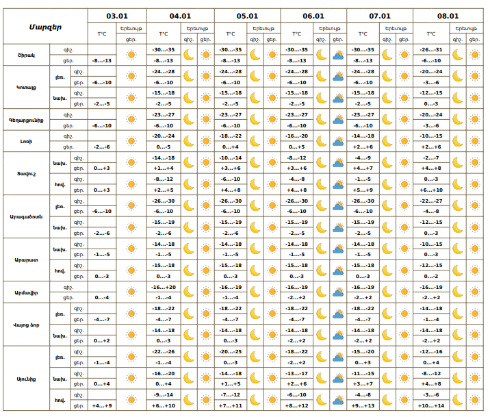 Հունվարի 3-ի ցերեկը, 4-8-ին սպասվում է առանց տեղումների եղանակ։ Քամին հյուսիսարևմտյան՝ 2-5մ/վ։ Օդի ջերմաստիճանը հունվարի 4-ի գիշերը կնվազի ևս 3-4 աստիճանով, հունվարի 5-8-ին Լոռիում, Տավուշում և Սյունիքում աստիճանաբար կբարձրանա 8-10 աստիճանով, հուվարի 8-ին հանրապետության մնացած շրջաններում կբարձրանա 3-4 ատիճանով։