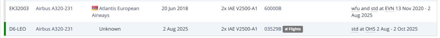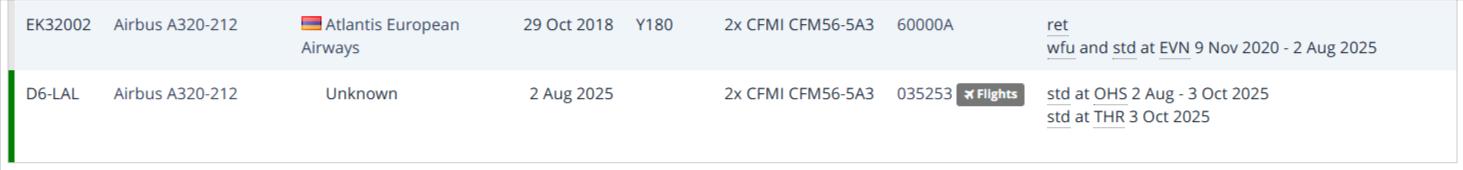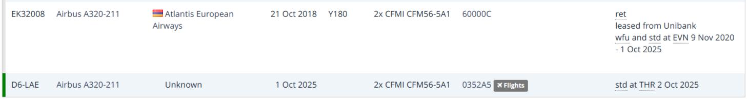 Այսպես՝ 2020-2025 թթ. ընթացքում «Զվարթնոց» օդանավակայանում պարապուրդի մատնված նախկին EK-32002-ը (կրկնենք՝ կիպրական Arolova Enterprises Limited-ին պատկանող այս բորտը 2023-ի նոյեմբերից չուներ ՀՀ գրանցում, բայց այլ երկրում էր չէր գրանցվել), ըստ planespotters.net-ի, 2025-ի օգոստոսի 2-ին գրանցվել է Հնդկական օվկիանոսում գտնվող Կոմորյան կղզիների ռեգիստրում որպես D6-LAL: