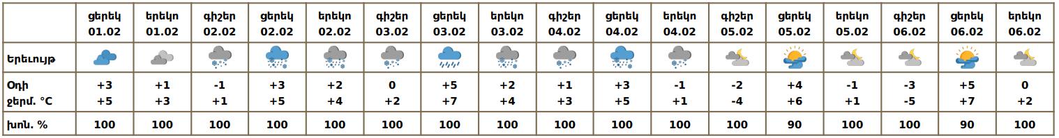 Փետրվարի 1-ի ցերեկը, 5-6-ին սպասվում է առանց տեղումների եղանակ։ Փետրվարի 2-4-ին սպասվում են տեղումներ՝ ձյան և ձնախառն անձրևի տեսքով։ Փետրվարի 2-3-ին գիշերը և առավոտյան սպասվում է մառախուղ։