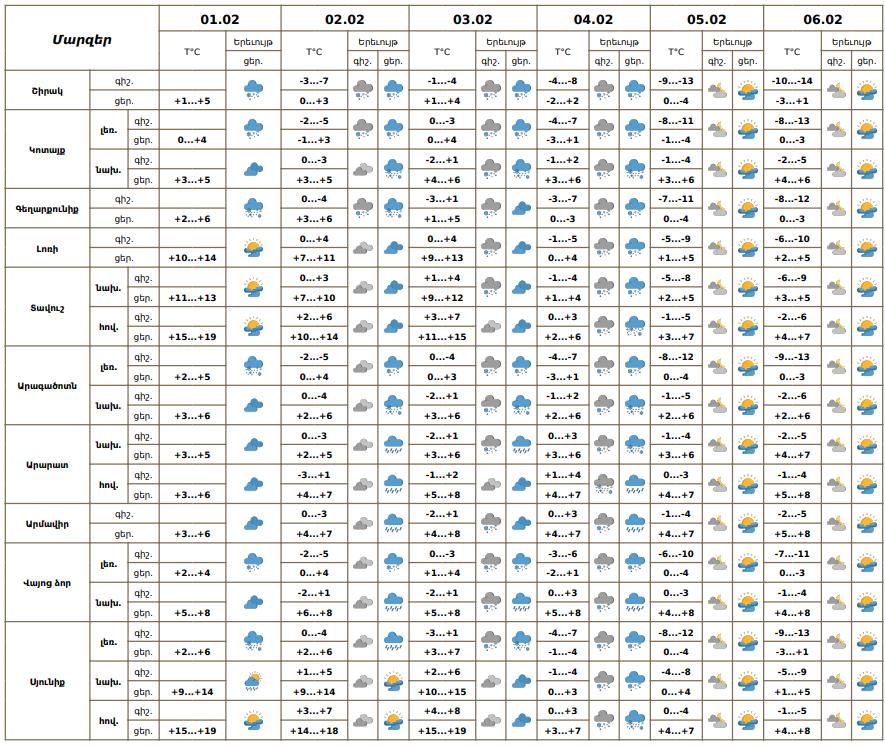 Փետրվարի 1-ի ցերեկը, 2-4-ին առանձին շրջաններում սպասվում են տեղումներ, նախալեռնային և հովտային շրջաններում՝ ձնախառն անձրևի, լեռնային շրջաններում ձյան տեսքով, լեռնային առանձին շրջաններում՝ բուք, ցածր հորիզոնական տեսանելիություն։ Փետրվարի 5-6-ին սպավում է առանց տեղումների եղանակ։ Քամին` հարավարևմտյան` 3-6մ/վ, փետրվարի 1-ի ցերեկը, 2-5-ին առանձին շրջաններում սպասվում է նաև քամու ուժգնացում՝ 17-20 մ/վ արագությամբ։ Փետրվարի 2-3-ին գիշերը և առավոտյան Շիրակի դաշտի ցածրադիր հատվածներում, Արագածոտնի և Կոտայքի նախալեռներում, Արարատյան դաշտում սպասվում է մառախուղ։ Օդի ջերմաստիճանը փետրվարի 1-3-ի ցերեկային ժամերին աստիճանաբար կբարձրանա 2-4 աստիճանով, Արարատյան դաշտում և նրա նախալեռներում ՝ 4-6 աստիճանով։