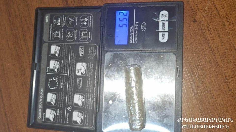«Նրա մոտից հայտնաբերել են թմրամիջոցի նմանվող դեղնականաչավուն, բուսական զանգված՝ 5.52 գրամ քաշով: Հայտնաբերված զանգվածն ուղարկվել է ՀՀ ՔԿ Արմավիրի մարզային քննչական վարչության Վաղարշապատի քննչական բաժին»,- ասված է Քրեակատարողական ծառայության Հանրային կապերի բաժնի հաղորդագրության մեջ։