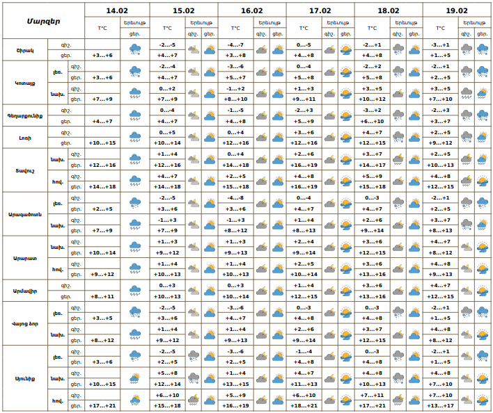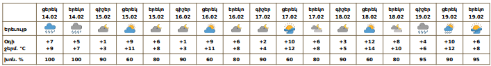 Փետրվարի 14-ի ցերեկը շրջանների զգալի մասում, 15-ի և 18-ի գիշերը, 19-ին առանձին շրջաններում սպասվում են տեղումներ․ նախալեռնային և հովտային շրջաններում՝ անձրևի և ձնախառն անձրևի, լեռնային շրջաններում՝ ձյան տեսքով։ Լեռնային առանձին շրջաններում սպասվում է նաև բուք, ցածր հորիզոնական տեսանելիություն։ Փետրվարի 15-ի ցերեկը, 16-17-ին, 18-ի ցերեկը սպասվում է առանց տեղումների եղանակ։