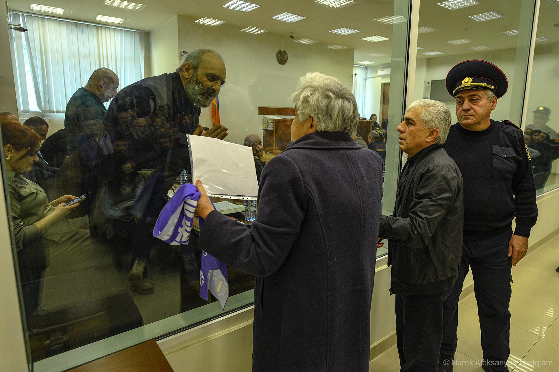 Հանրային մեղադրողի ելույթից հետո ապակուց այն կողմ, որտեղ նստած էին Սրբազան պայքարի աջակիցները, իրավիճակը լարվեց։