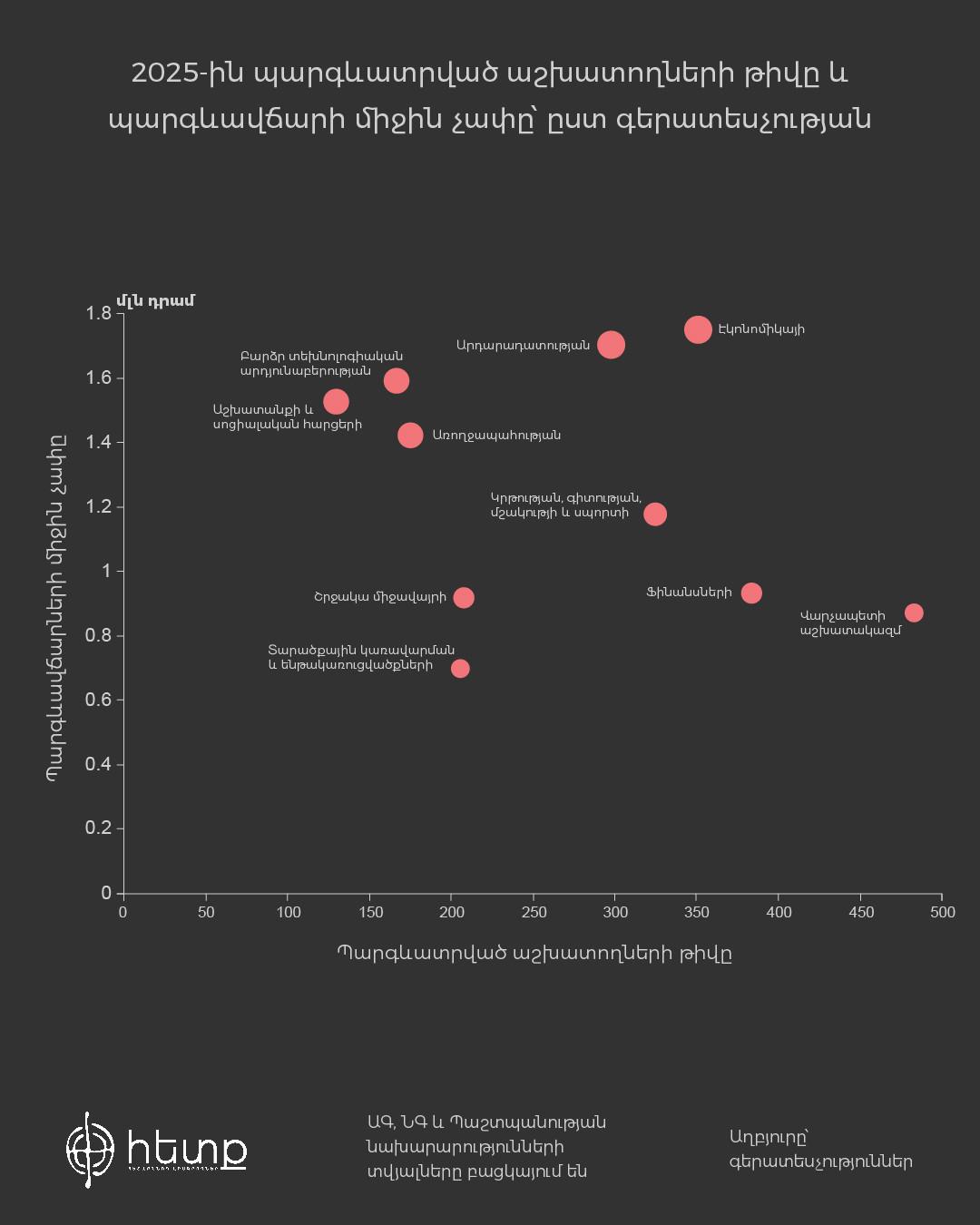 Նախարարությունների և վարչապետի աշխատակազմի պարգևատրման բյուջեի մեծությունը հիմնականում պայմանավորված է աշխատակիցների թվով, սակայն, բացառություններ լինում են: Որքան մեծ է նախարարության աշխատակիցների թիվը, այնքան մեծ է պարգևատրման բյուջեի գումարը: 2025թ. 10 նախարարությունների և վարչապետի աշխատակազմի պարգևավճարների ընդհանուր բյուջեի կեսից ավելին՝ 67.95%-ը, բաժին է ընկնում ՆԳՆ-ին, այնուհետև Էկոնոմիկայի նախարարությանը՝ 5.91%: 2025թ. Էկոնոմիկայի նախարարության 351 աշխատակիցները միասին ստացել են 614 մլն 430 հազ. դրամ պարգևավճար, միջինը՝ մոտ 1 մլն 750 հազ. դրամ: Սա չի նշանակում, որ նախարարության բոլոր աշխատակիցներն այդ չափով են պարգևատրվել: Բարձր պաշտոն ունեցողների բարձր պարգևավճարների հաշվին է միջին ցուցանիշը մեծացել: