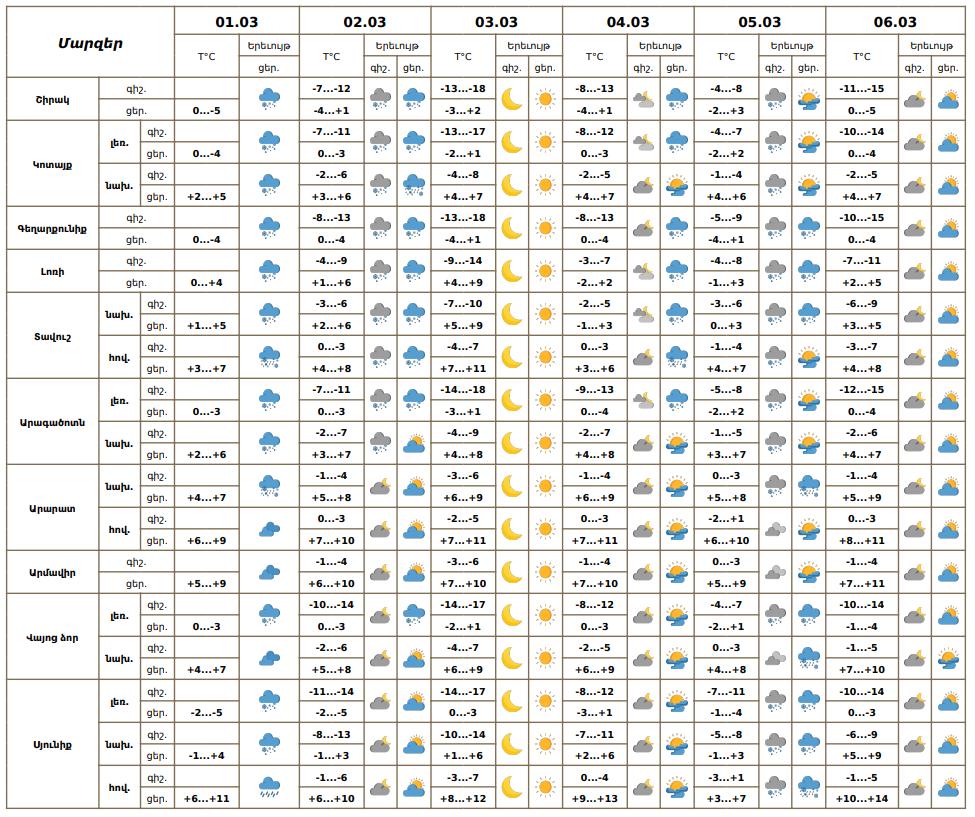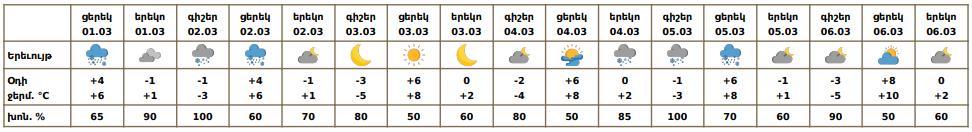 Մարտի 1-ի ցերեկը, մարտի 2-ին, 4-ի ցերեկը, 5-ին առանձին շրջաններում սպասվում են տեղումներ․ լեռնային և նախալեռնային շրջաններում ձյան, հովտային շրջաններում ձնախառն անձրևի և անձրևի տեսքով։ Լեռնային շրջաններում սպասվում է նաև բուք, ցածր հորիզոնական տեսանելիություն։ Ավտոճանապարհների առանձին հատվածներում սպասվում է նաև մերկասառույց։ Մարտի 3-ին, 4-ի գիշերը, 6-ին սպասվում է առանց տեղումների եղանակ։ Քամին`հյուսիսարևմտյան` 2-5 մ/վ։ Օդի ջերմաստիճանը մարտի 2-3-ի գիշերային ժամերին աստիճանաբար կնվազի 6-9 աստիճանով:
