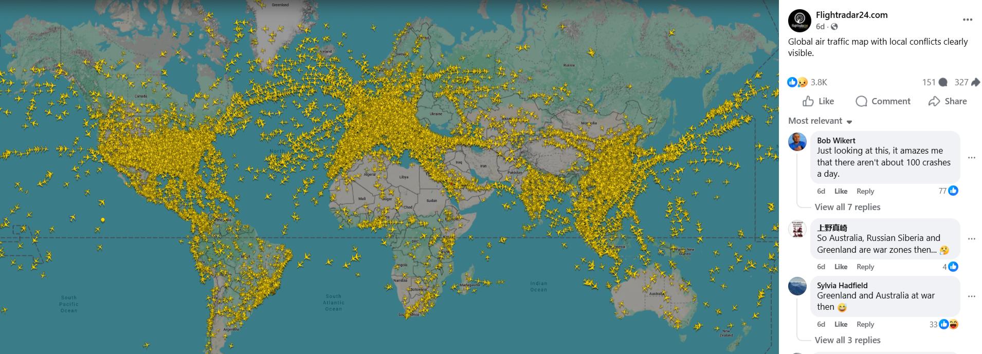 Փետրվարի 28-ին՝ Մերձավոր Արեւելքում սկսված հերթական պատերազմից ժամեր անց, flightradar24.com-ը տարածեց ավիացիոն գլոբալ հոսքերի պատկերը, որտեղ երեւում են քաղաքացիական թռիչքներից ազատ այնպիսի կոնֆլիկտային գոտիներ, ինչպիսիք են Ուկրաինան, Ռուսաստանի հարավ-արեւմուտքը, Բելառուսը, Մերձավոր Արեւելքը, այդ թվում՝ ներկայիս կոնֆլիկտի մեջ ներքաշված երկրները, նաեւ՝ Սիրիան, Եմենը: