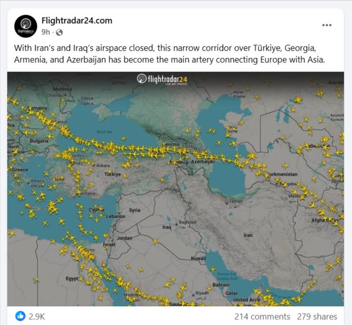 Մինչեւ ԱՄՆ-Իրան-Իսրայել պատերազմի մեկնարկը Եվրոպայից դեպի Մերձավոր Արեւելք, Հնդկաստան, Հարավարեւելյան Ասիա եւ Ավստրալիա թռիչքներն իրականացվում էին Իրանով, Իրաքով, Քաթարով ու ԱՄԷ-ով անցնող օդային մայրուղիներով: Պատերազմի մեկնարկին զուգահեռ այս մեծ հոսքերը դադարել են, ինչը կարելի է տեսնել flightradar24.com-ի տարածած կարճ տեսանյութում: