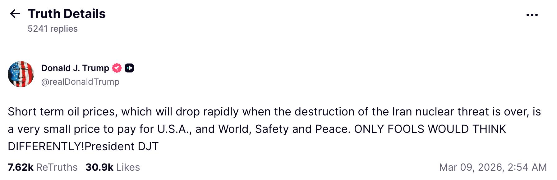 ԱՄՆ նախագահ Դոնալդ Թրամփը Truth Social սոցիալական ցանցում գրել է, որ նավթի գների աճը կարճաժամկետ է, արագ կմարի, երբ վերացվի իրանական միջուկային սպառնալիքը։ Թրամփն այս թանկացումը որակել է որպես շատ փոքր գին ԱՄՆ-ում և աշխարհում անվտանգության և խաղաղության համար։