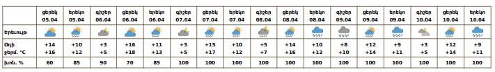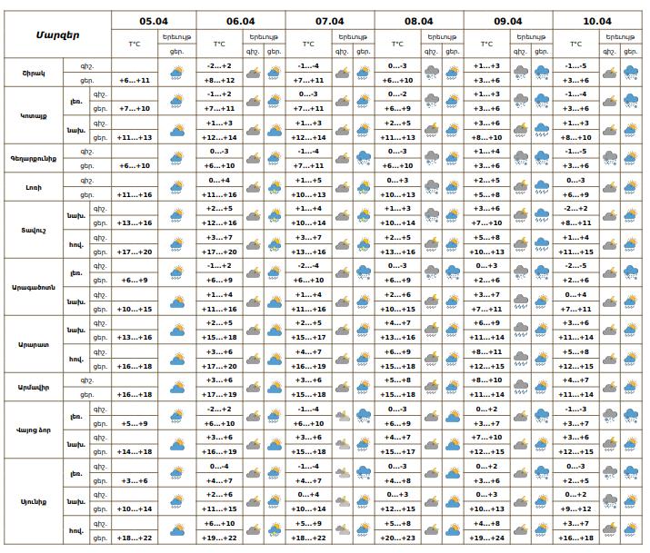Ապրիլի 5-ի, 6-ի և 7-ի ցերեկը, 8-10-ին ժամանակ առ ժամանակ առանձին շրջաններում սպասվում են տեղումներ. լեռնային գոտիներում՝ ձյան և թաց ձյան, նախալեռնային և հովտային գոտիներում՝ անձրևի տեսքով։ Ապրիլի 6-ի և 7-ի գիշերը սպասվում է առանց տեղումների եղանակ։ Քամին` հարավարևմտյան` 2-5 մ/վ, ապրիլի 8-9-ին առանձին շրջաններում սպասվում է քամու ուժգնացում 15-18 մ/վ արագությամբ: Օդի ջերմաստիճանն ապրիլի 5-6-ին ցերեկային ժամերին աստիճանաբար կբարձրանա 2-4, Լոռիում, Տավուշում՝ 6-8 աստիճանով։