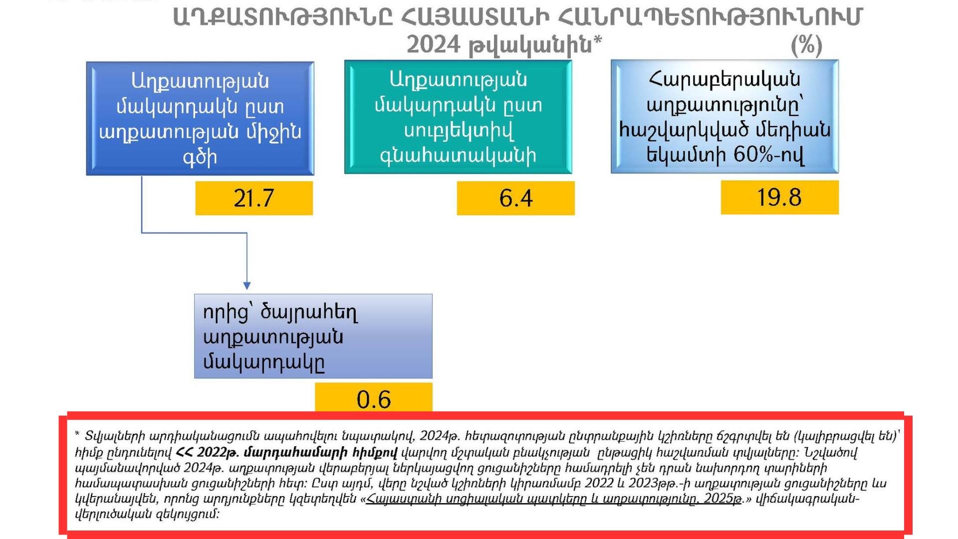 Աշխատանքի և սոցիալական հարցերի նախարար Արսեն Թորոսյանը իր ելույթում նշեց. «Մենք մոտեցել ենք ծայրահեղ աղքատության վերացմանը, էականորեն կրճատել աղքատությունն ու գործազրկությունը»։ Ըստ էության, Թորոսյանը նկատի է ունեցել 2025-ի նոյեմբերին ՀՀ վիճակագրական կոմիտեի հրապարակած տվյալները 2024 թ. Հայաստանում աղքատության պատկերի մասին (2025-ի տվյալները պետք է հրապարակվեն այս տարի):