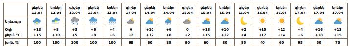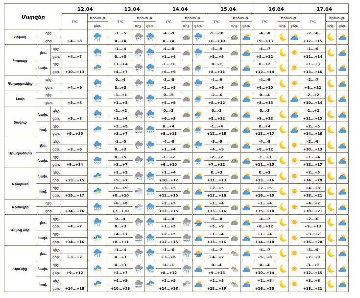 Ապրիլի 12-ի ցերեկը, 13-ին ժամանակ առ ժամանակ շրջանների զգալի մասում, 14-ին առանձին շրջաններում սպասվում են տեղումներ. առանձին վայրերում՝ առատ։ Տեղումները ապրիլի 13-ին լեռնային և բոլոր նախալեռնային գոտիներում կդիտվեն ձյան, հովտային գոտիներում՝ անձրևի տեսքով։ Առանձին վայրերում սպասվում է ամպրոպ։ Ապրիլի 15-17-ին սպասվում է առանց տեղումների եղանակ։ Քամին` հարավարևմտյան` 2-5 մ/վ: Օդի ջերմաստիճանն ապրիլի 13-ի ցերեկը և 14-ի գիշերը կնվազի 5-7 աստիճանով, ապրիլի 15-17-ին հատկապես ցերեկային ժամերին աստիճանաբար կբարձրանա 9-13 աստիճանով։