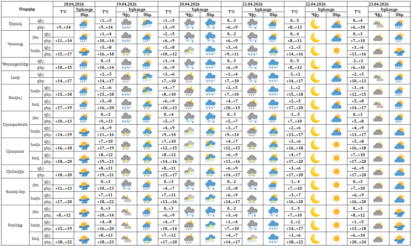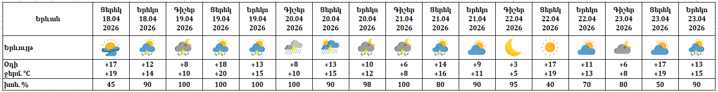 Երևանում ապրիլի 18-ին կեսօրից հետո հնարավոր է կարճատև անձրև։ Ապրիլի 19-21-ին ժամանակ առ ժամանակ, 23-ին կեսօրից հետո սպասվում է անձրև և ամպրոպ, ապրիլի 20-ին՝ ինտենսիվ։ ամպրոպի ժամանակ՝ քամու ուժգնացում մինչև 15-18մ/վ արագությամբ։ Ապրիլի 22-ին, 23-ի գիշերը սպասվում է առանց տեղումների եղանակ։
