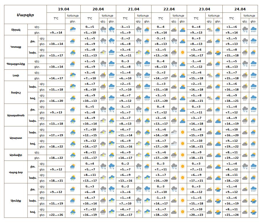 Ապրիլի 19-ի ցերեկը, 20-21-ին ժամանակ առ ժամանակ շրջանների զգալի մասում, 22-ի գիշերը, 23-ի ցերեկը, 24-ին առանձին շրջաններում սպասվում է անձրև, հնարավոր է ամպրոպ։ Ապրիլի 19-ի երեկոյան ժամերին, 20-21-ին, 22-ի գիշերն առանձին շրջաններում տեղումները կլինեն ինտենսիվ։ Ապրիլի 20-22-ին, 24-ին տեղումները լեռնային շրջաններում գիշերը և առավոտյան ժամերին կլինեն թաց ձյան տեսքով։ Ապրիլի 22-ի ցերեկը, 23-ի գիշերը սպասվում է առանց տեղումների եղանակ։ Քամին` հարավարևմտյան` 2-5 մ/վ, ամպրոպի ժամանակ սպասվում է նաև քամու ուժգնացում 16-19մ/վ արագությամբ: Օդի ջերմաստիճանն ապրիլի 20-ի ցերեկը կնվազի 4-6 աստիճանով, ապրիլի 22-24-ին ցերեկային ժամերին աստիճանաբար կբարձրանա 2-4 աստիճանով։