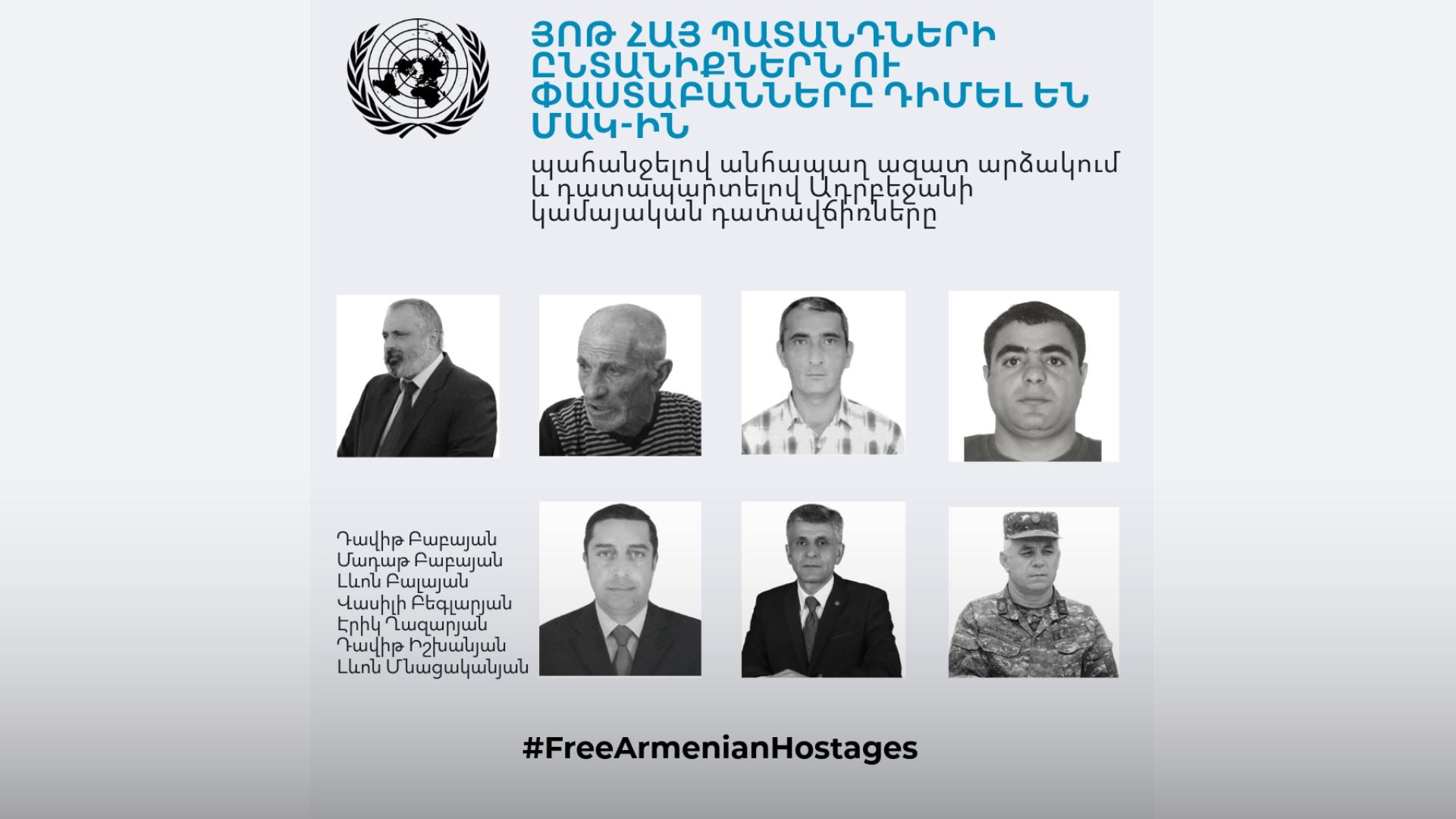 «Ադրբեջանում բանտարկված յոթ հայ պատանդների ընտանիքներին ներկայացնող միջազգային փաստաբանները պաշտոնական դիմում են ներկայացրել ՄԱԿ-ի Կամայական ազատազրկման հարցերով աշխատանքային խմբին՝ պահանջելով նրանց անհապաղ և անվերապահ ազատ արձակումը: Յոթը դատապարտվել են քաղաքացիական, այլ ոչ թե ռազմական հանցագործությունների համար։ Հետևաբար, միջազգային իրավունքի համաձայն, նրանց գործերը պետք է քննվեին քաղաքացիական դատարանում։