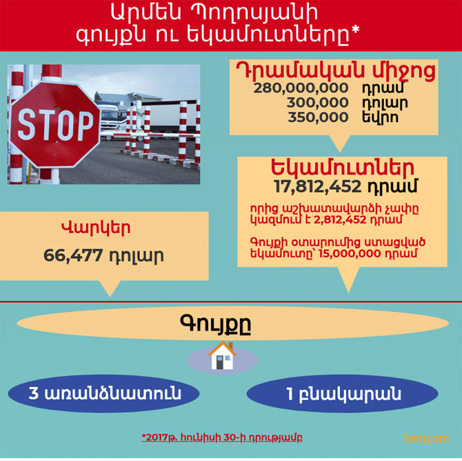 ՊԵԿ-ի Արևմտյան մաքսատուն-վարչության պետի տեղակալ Արմեն Պողոսյանն առաջին անգամ է ներկայացնում գույքի ու եկամուտների վերաբերյալ հայտարարագիր: Ուսումնասիրելով հրապարակման ենթակա տեղեկությունները, պարզեցինք, որ նա հուլիսի 1-ի դրությամբ բավականին ունեցվածք ունի: