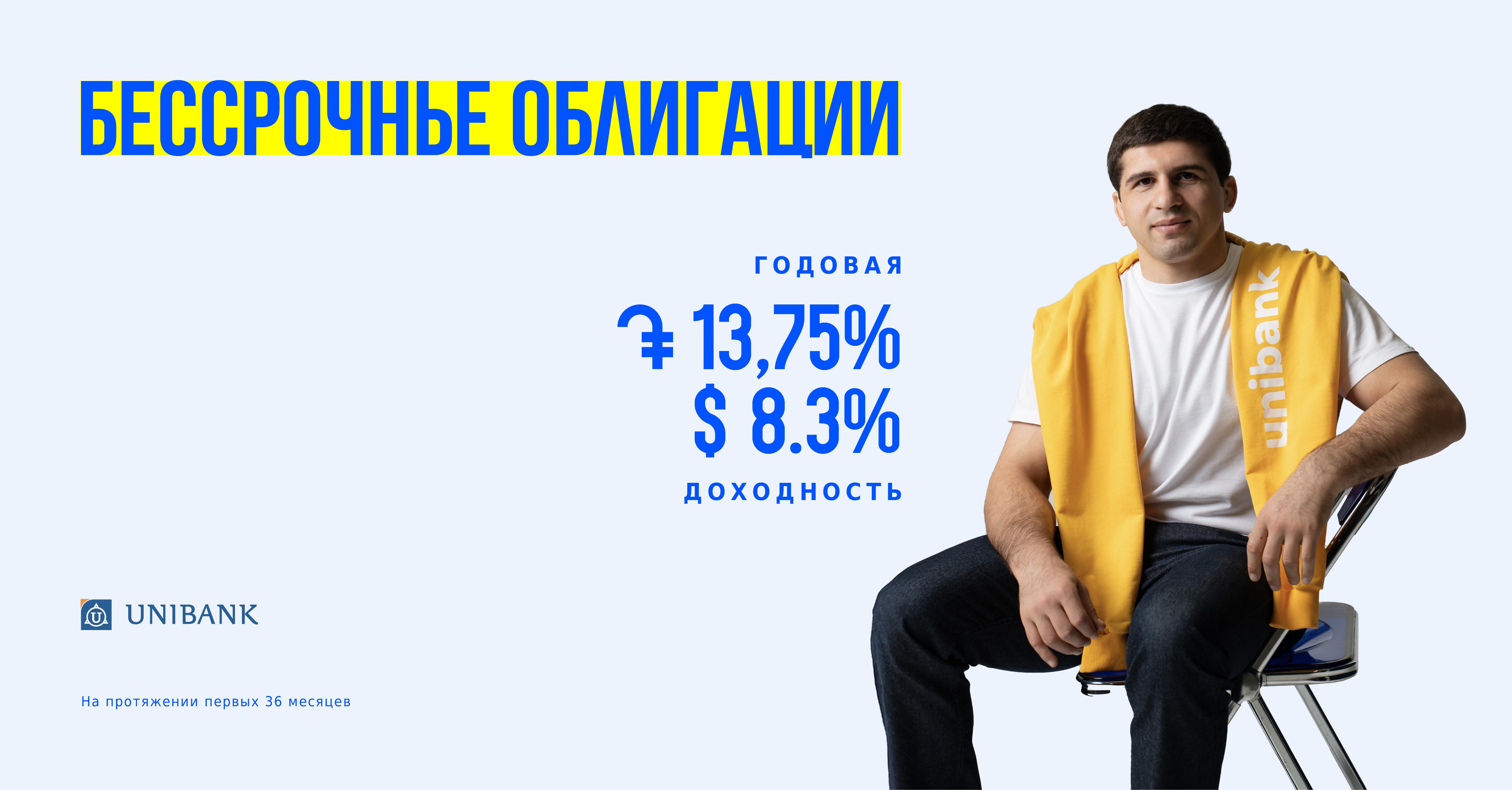 Юнибанк объявляет о размещении первых на армянском рынке бессрочных облигаций общим объемом 3,5 млрд драмов РА и 9 млн долларов США. Купонная ставка по драмовым облигациям составляет 13,75% годовых, а по долларовым — 8,3% годовых.