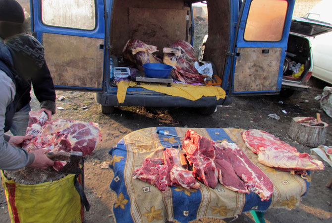 С раннего утра из соседних сел сюда привозят и прямо на улице организуют продажу свинины, говядины, баранины, птицы и т.д. Санитарно-гигиенические нормы не соблюдается, что, по всей видимости, не беспокоит руководителей сферы.